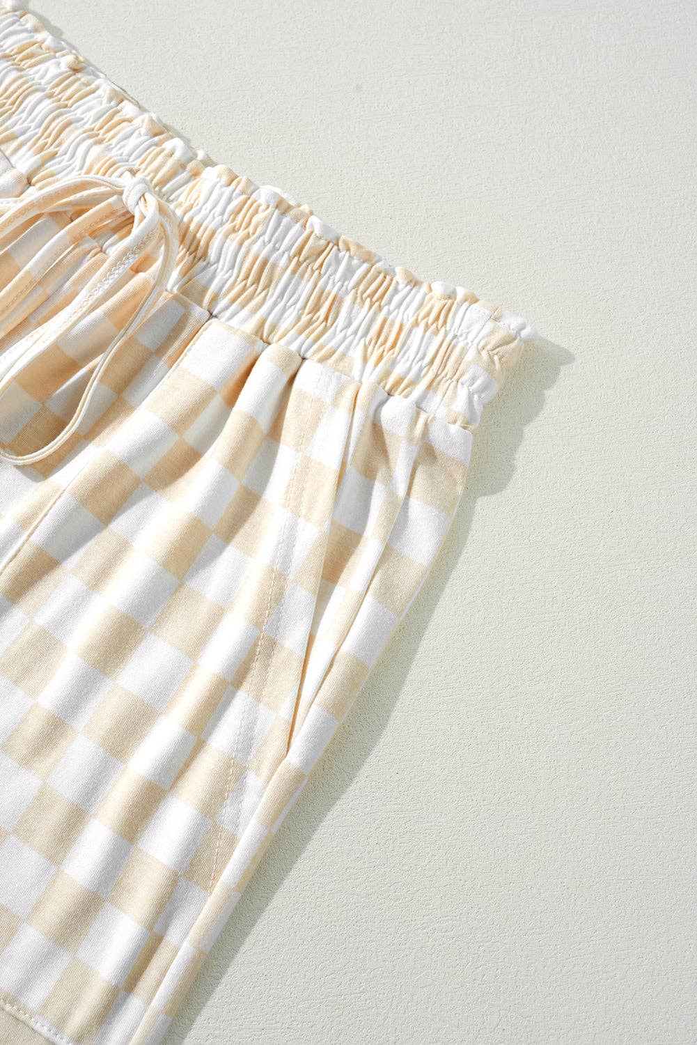 Beige Checkered Print Long Sleeve Top and Pants Lounge Set